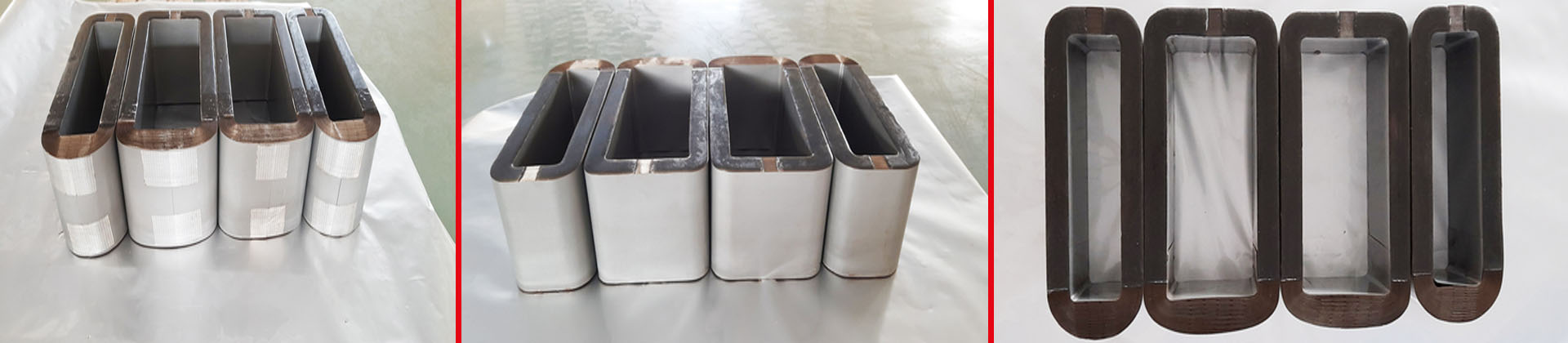 The amorphous is a non-crystal substance created by rapidly freezing liquids of high temperature. Because there is no rule of atomic arrangement, the energy loss (hysteresis loss) is small when the flux of magnetic induction passes the iron core. In addition, eddy current loss is decreased because the thickness is approximately 0.03 mm, which is about 1/10 comparing with silicon steel. Therefore, the no-load loss (eddy current loss and hysteresis loss) can be decreased to about 1/5 of silicon steel. In transformers with amorphous cores, a ribbon of amorphous steel is wound to form the core. T.I Industries produces high-quality amorphous distributed gap (wound) cores according to Customer specification for single-phase and three-phase distribution transformer applications By using MetglasĀ® amorphous metal. Epoxy coating is applied to some parts of the cores in order to get mechanical rigidity.